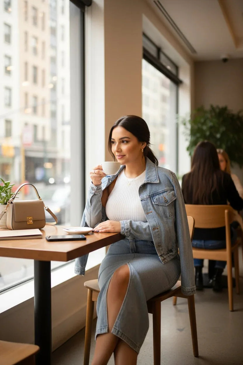 Step out in effortless style with this versatile Women's Denim Jacket & Maxi Skirt Set. This coordinated two-piece outfit takes the classic "denim on denim" trend and makes it chic and modern. The set features a trendy cropped denim jacket with a traditional button-up front, a classic collar, and buttoned chest pockets. Paired with it is a matching high-waisted denim maxi skirt that offers a flattering silhouette and a stylish front slit for ease of movement. Both pieces are made from a high-quality, light-wash denim, making them perfect for a variety of casual and smart-casual occasions. Whether you're heading to a coffee date or a day out shopping, this outfit is designed to turn heads.