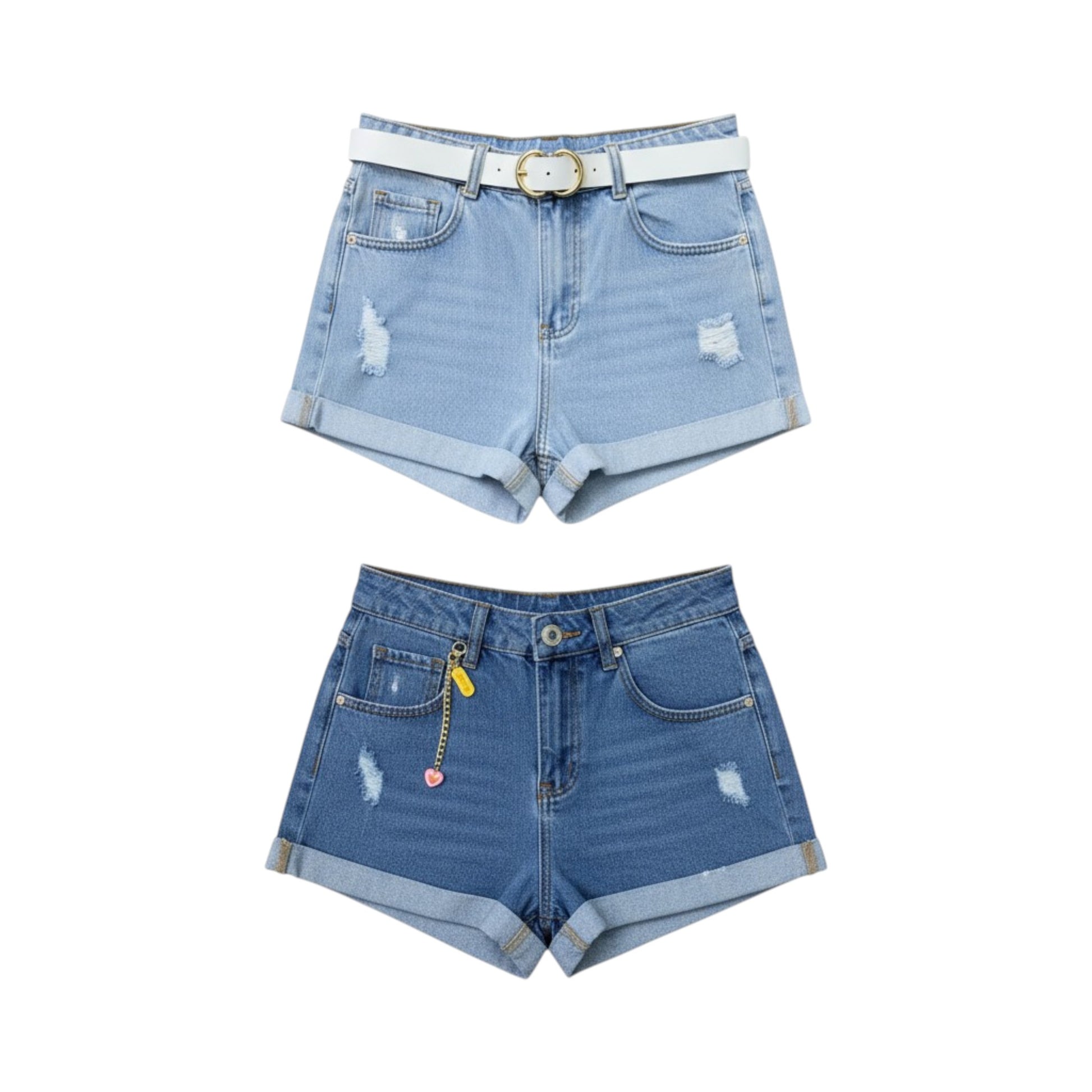 A stylish set of two pairs of women's high-waisted denim shorts, perfect for summer and casual fashion. Both pairs feature a trendy cuffed hem and subtle distressing/rips. The set includes a light wash blue pair (often pictured with a white belt accessory) and a darker indigo wash pair (pictured with a decorative charm). The high-rise design flatters the waist. Made from comfortable denim fabric with classic 5-pocket styling. Essential summer casual wear for teenagers and women.
